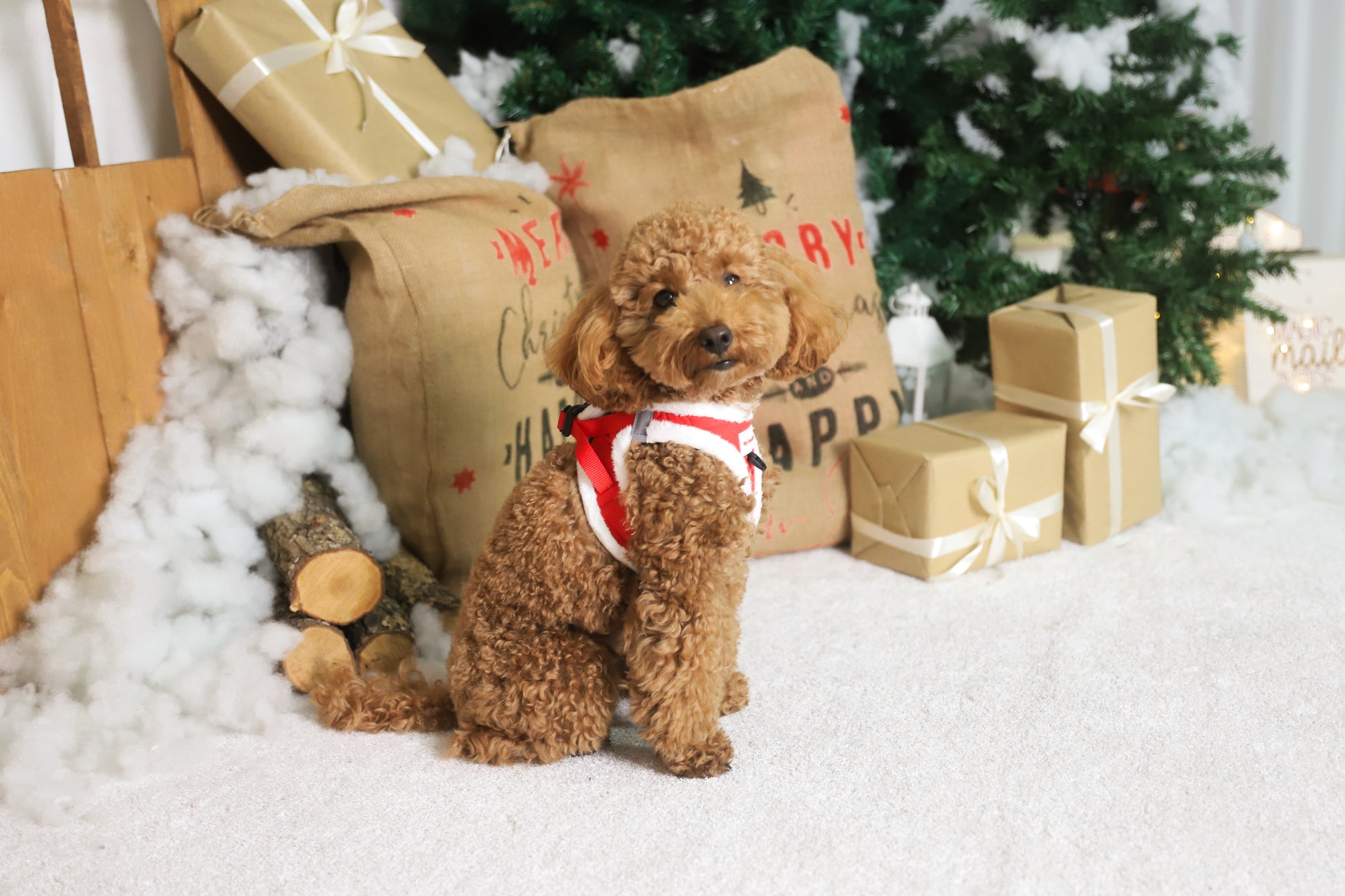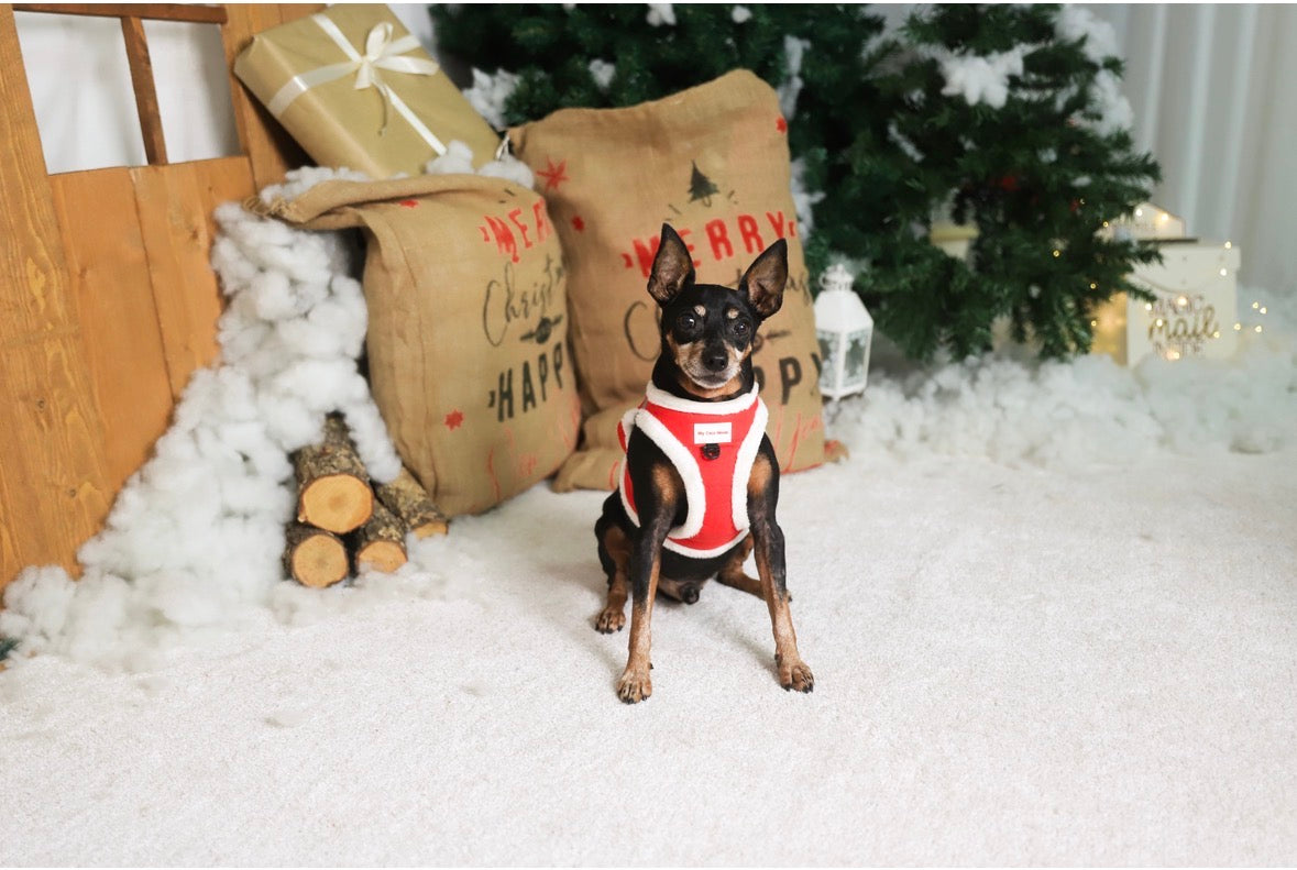 Este sin duda es el mejor conjunto navideño que podeis encontrar. Es tan adorable que parece un disfraz de Santa Claus, pero sin perder la comodidad y fácil forma de poner de un arnés.